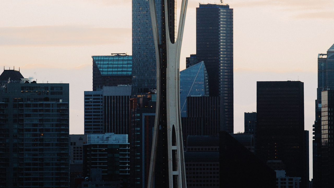 Обои 1280x720 Сиэтл Центр, космическая игла, Башня Сиэтл, Колумбийский центр, Смит Тауэр, HD, HDV, 720p, 16:9 картинка