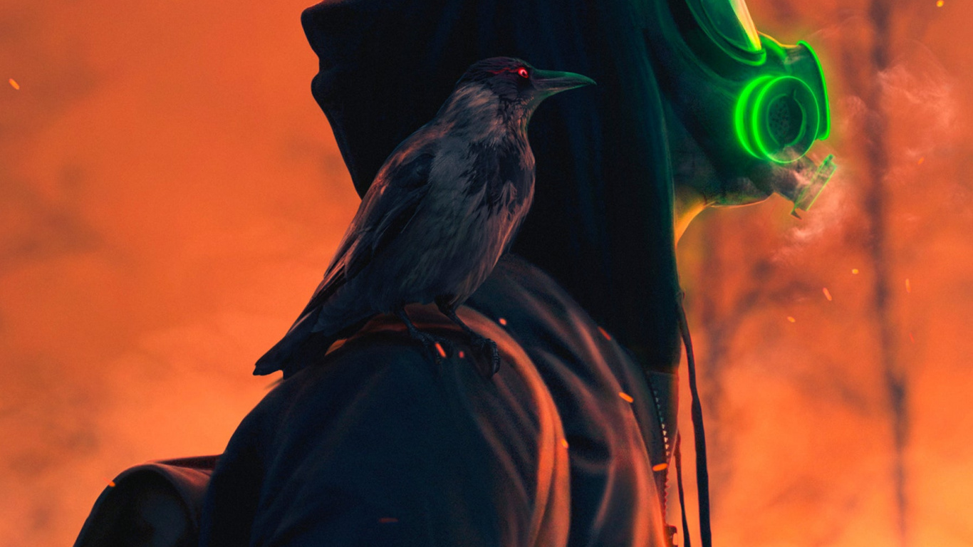 Обои 1366x768 Оранжевый цвет, дерево, клюв, птица, куртка, HD ready картинка