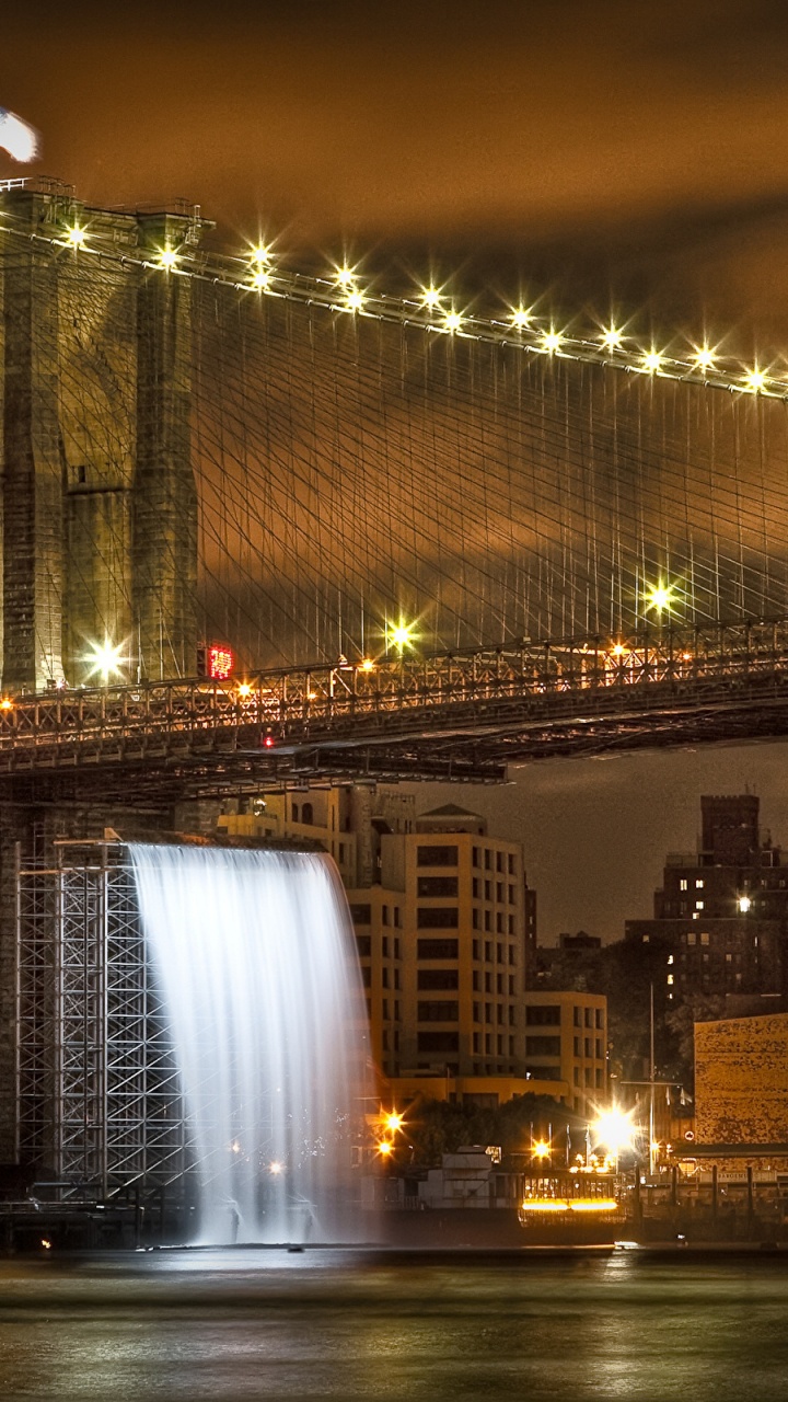 Обои Бруклинский мост, ночь, ориентир, город, мост для HD Samsung Galaxy S3/J3/J4/J5, Meizu M5, Sony Xperia L1/L2, заставка, 720x1280 картинка