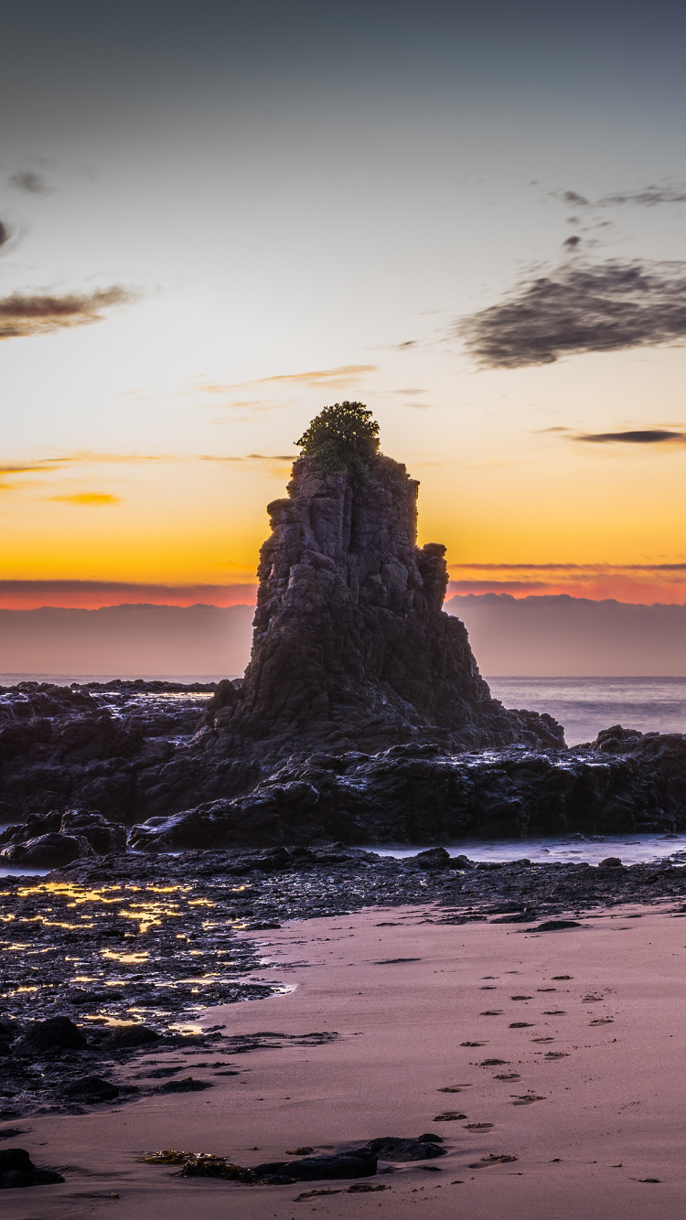 Обои рок, берег, закат, море, пляж для iPhone 6, 6S, 7, 8, заставка, 750x1334 картинка