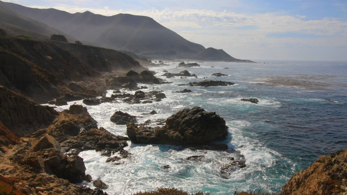 Обои 1366x768 побережье, плащ, берег, море, мыс, HD ready картинка