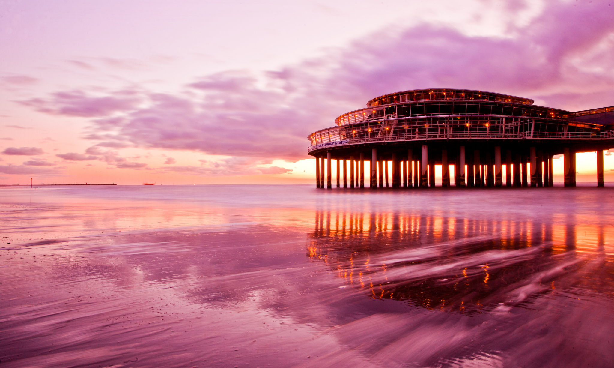Обои Пирс, отражение, море, горизонт, закат, фото, заставка