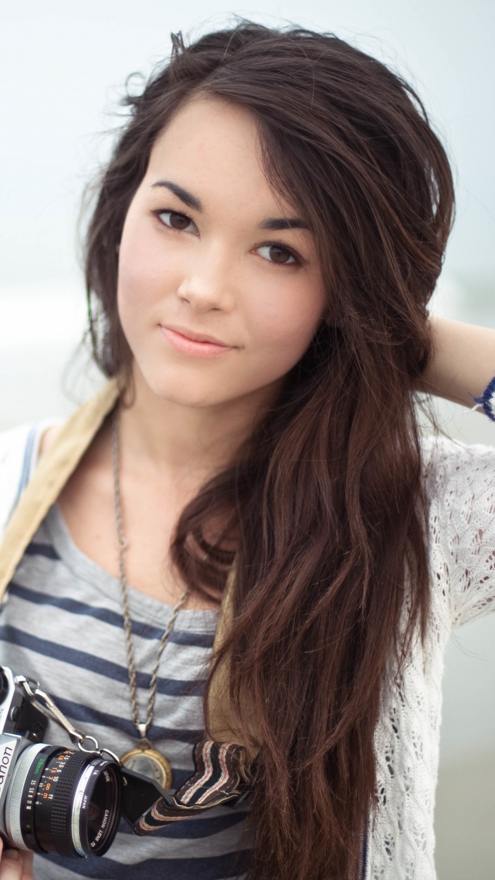 Обои красота, прическа, длинные волосы, улыбка, каштановые волосы для HD Samsung Galaxy S3/J3/J4/J5, Meizu M5, Sony Xperia L1/L2, заставка, 720x1280 картинка