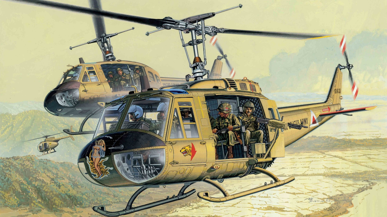 Обои 1280x720 винтокрылая машина, военный вертолет, война во Вьетнаме, Вьетнам, ударный вертолет, HD, HDV, 720p, 16:9 картинка