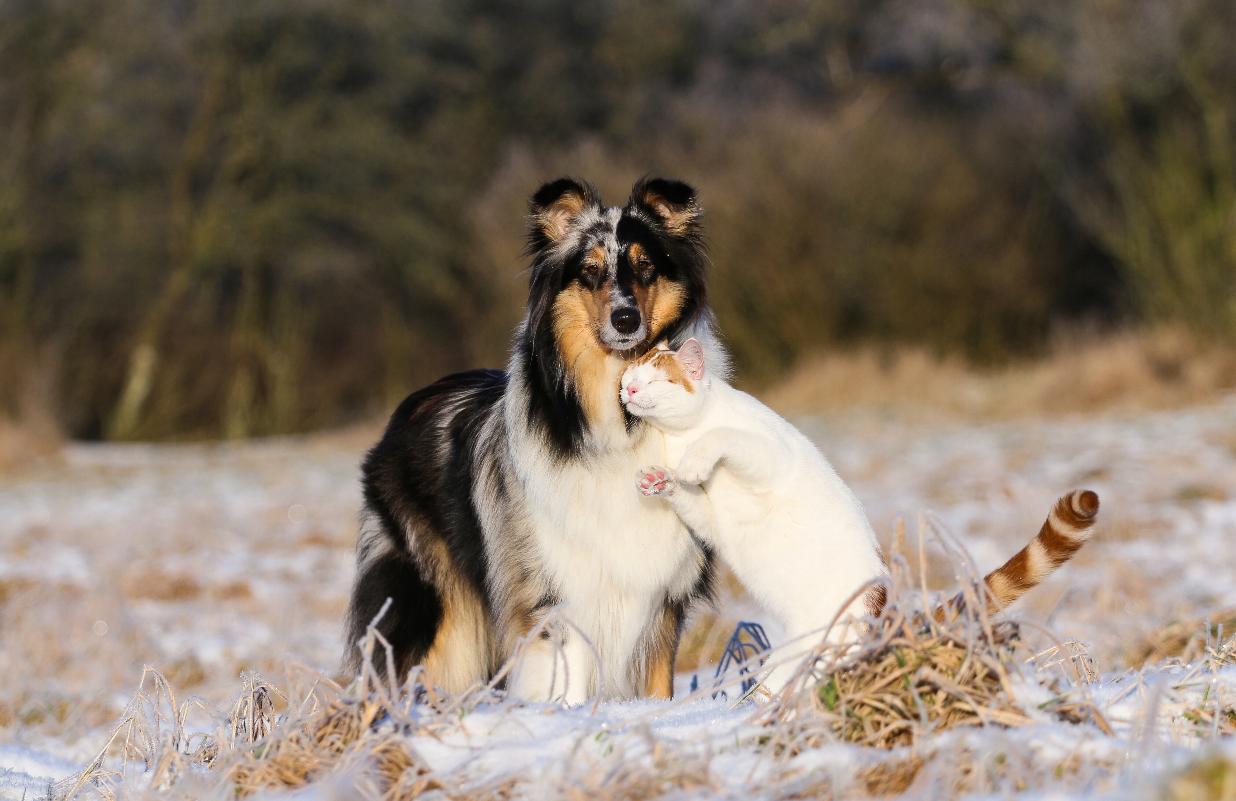 Обои колли длинношёрстный, кот, щенок, котенок, собака породы, фото, заставка