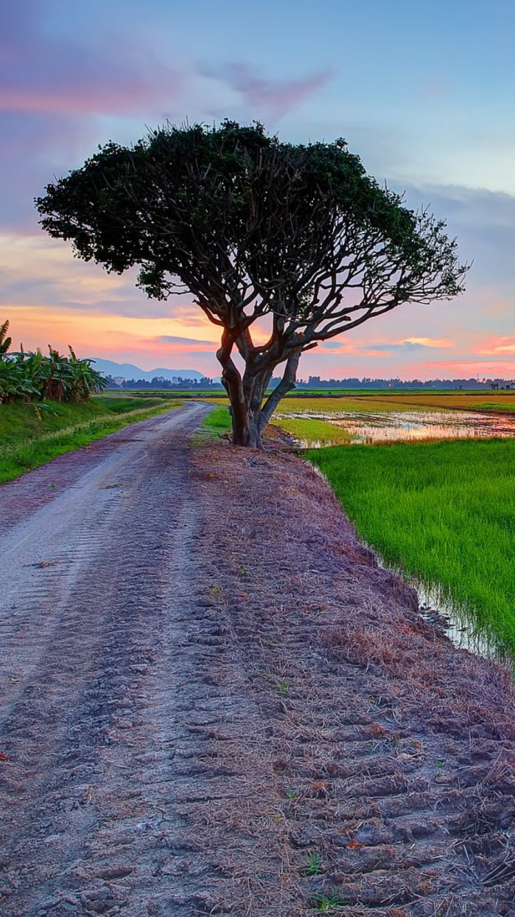 Обои горизонт, поле, дерево, дорога, сенокосное угодье для iPhone 6, 6S, 7, 8, заставка, 750x1334 картинка