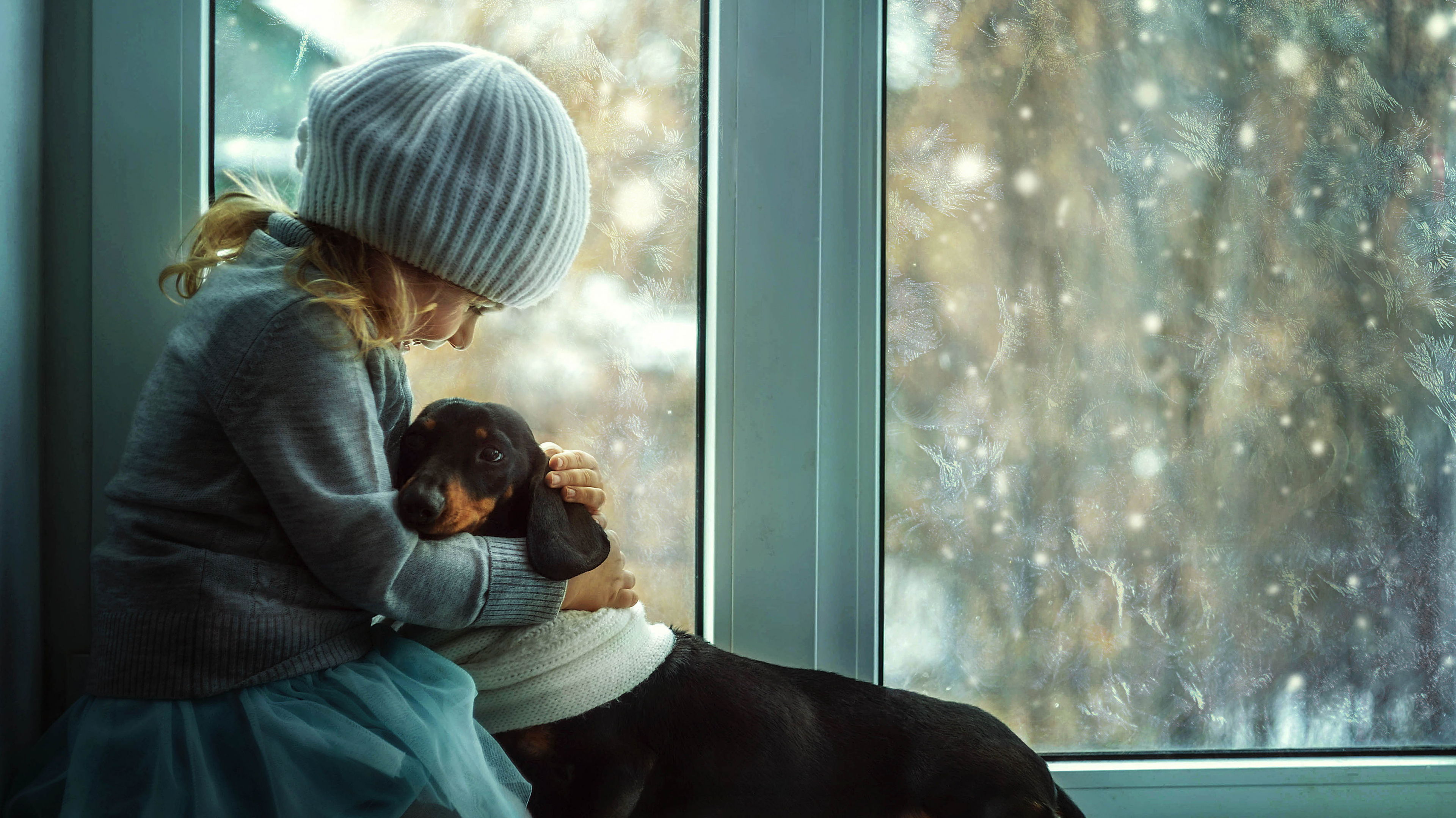 Обои 3840x2160 такса, пес, окно, сидящий, шапка, 4K Ultra HD картинка
