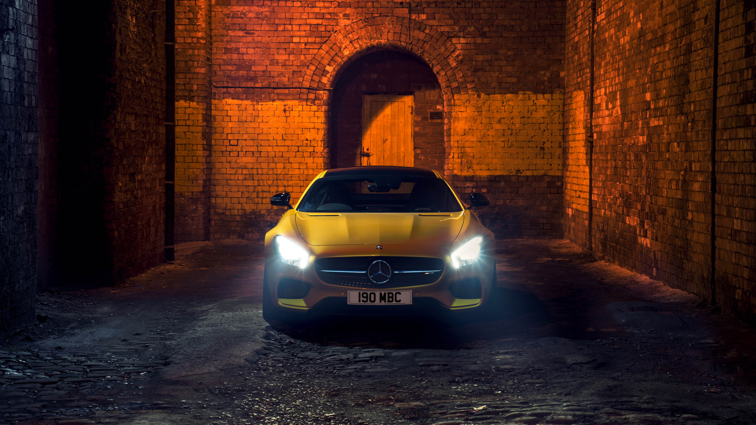 Обои 2560x1440 авто, свет, желтый, городской автомобиль, mercedes benz sls amg, WQHD, QHD, 16:9 картинка