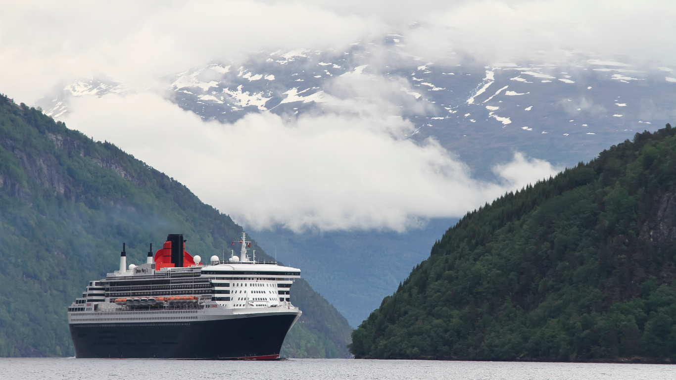 Обои 1366x768 корабль, круизное судно, пассажирское судно, фьорд, перевозка воды, HD ready картинка