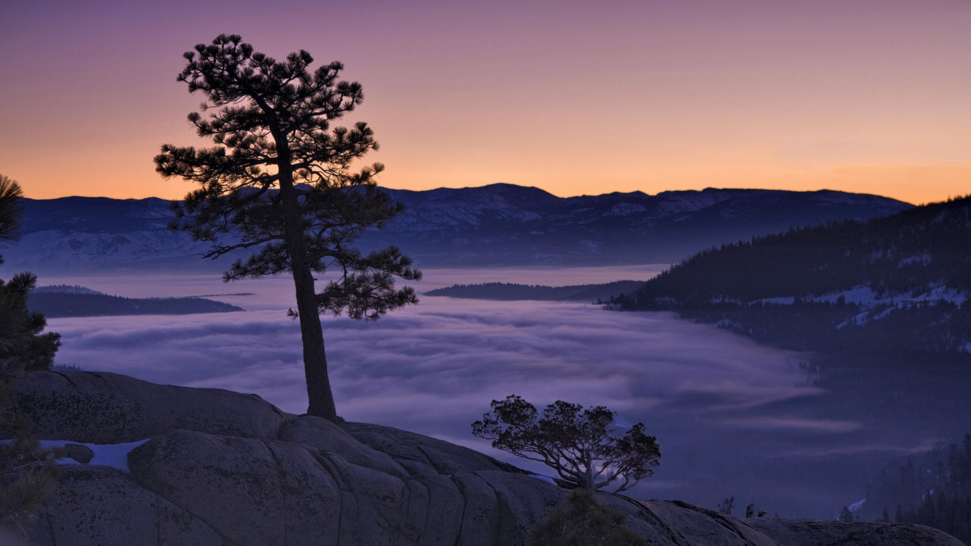 Обои 1366x768 озеро Тахо, природа, дерево, утро, восход солнца, HD ready картинка