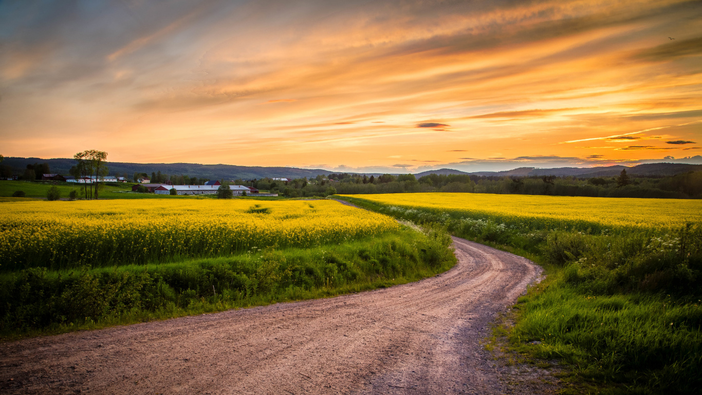 Обои 1366x768 горизонт, дорога, поле, закат, желтый, HD ready картинка