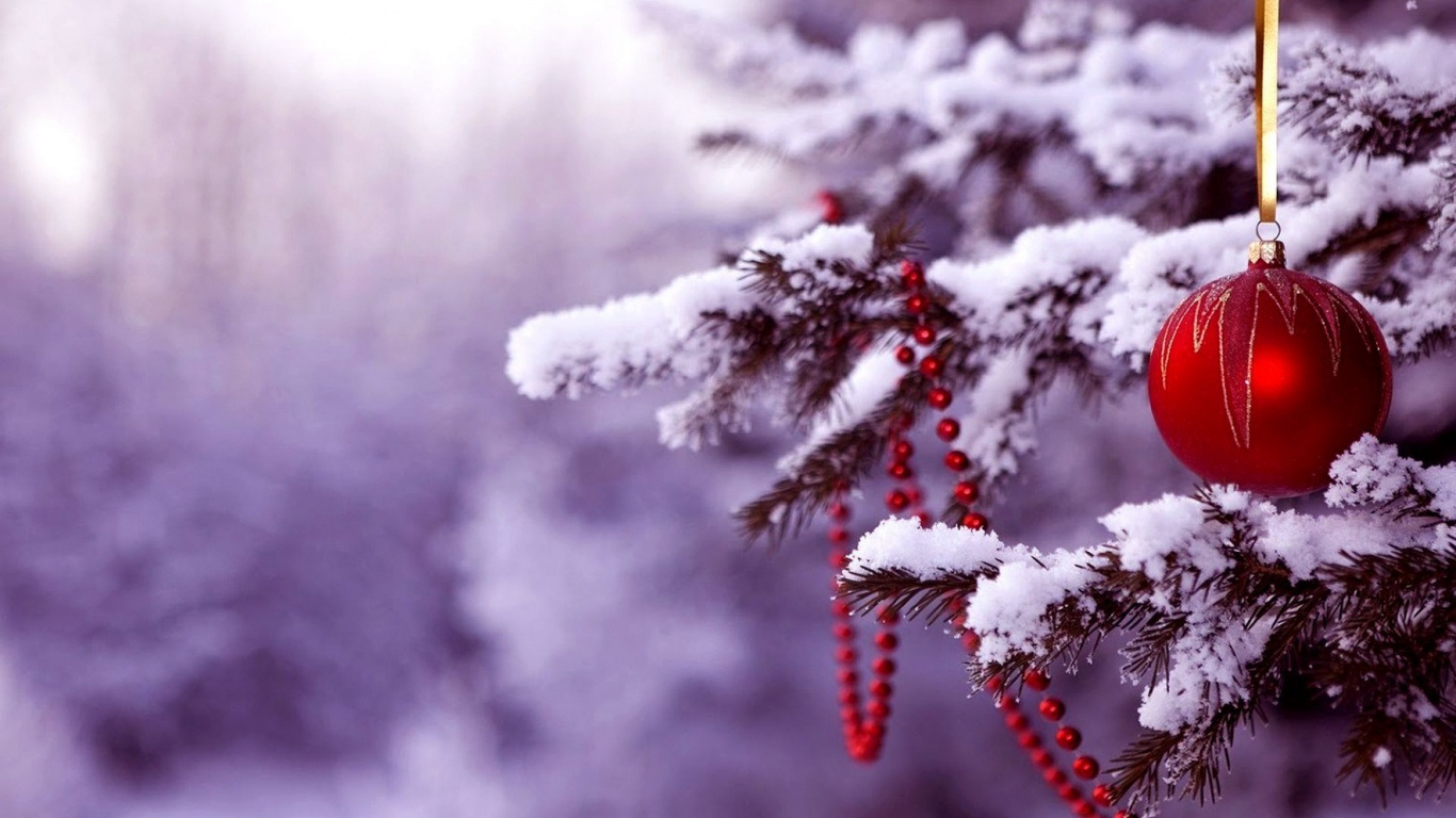 Обои 1366x768 Рождественский день, рождественский орнамент, елка, Рождественские украшения, снег, HD ready картинка