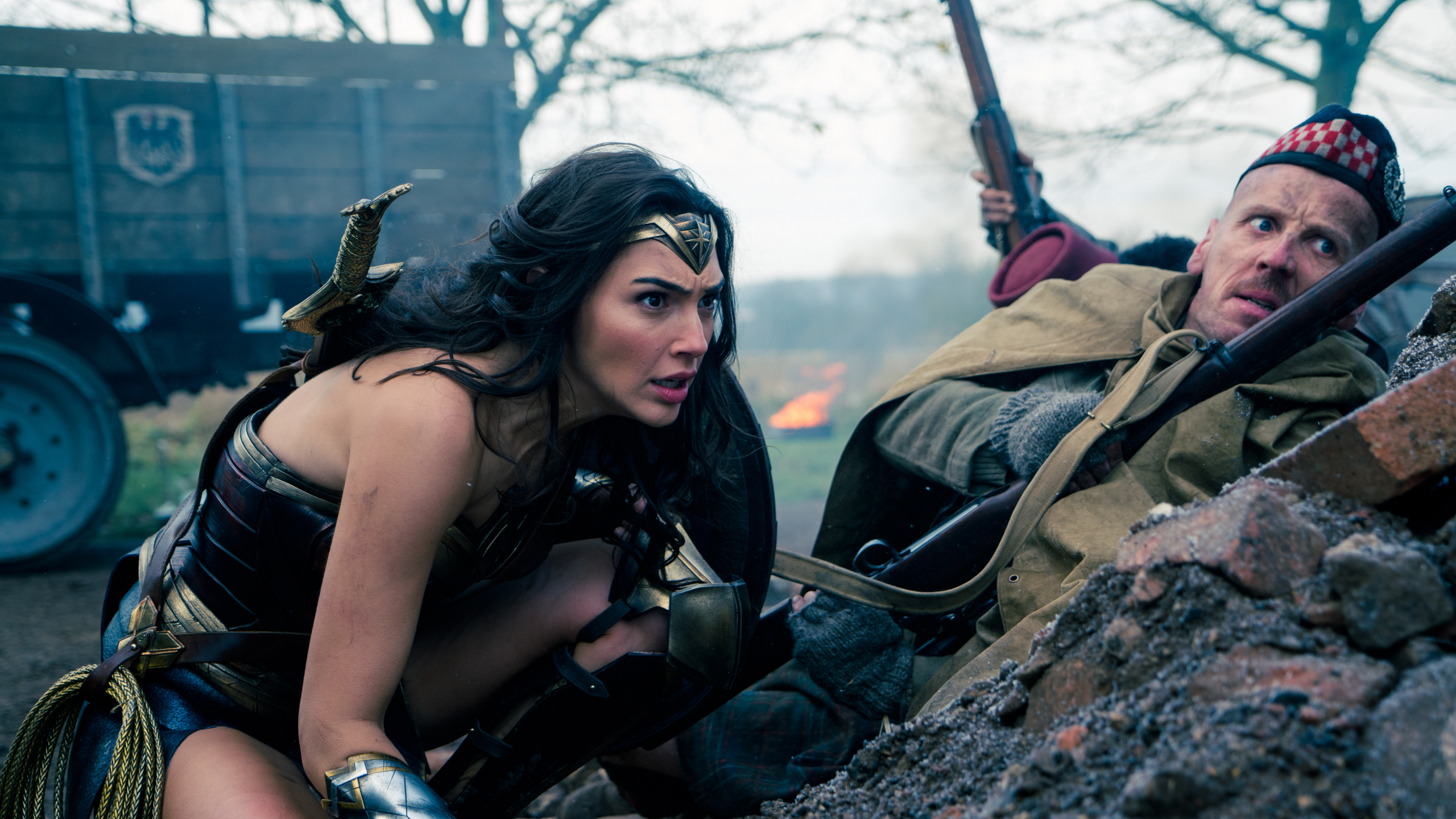 Обои 2560x1440 чудоженщина, Чудо-Женщина 1984, Гал гадот, Чудо-женщина в окопах, дерево, WQHD, QHD, 16:9 картинка