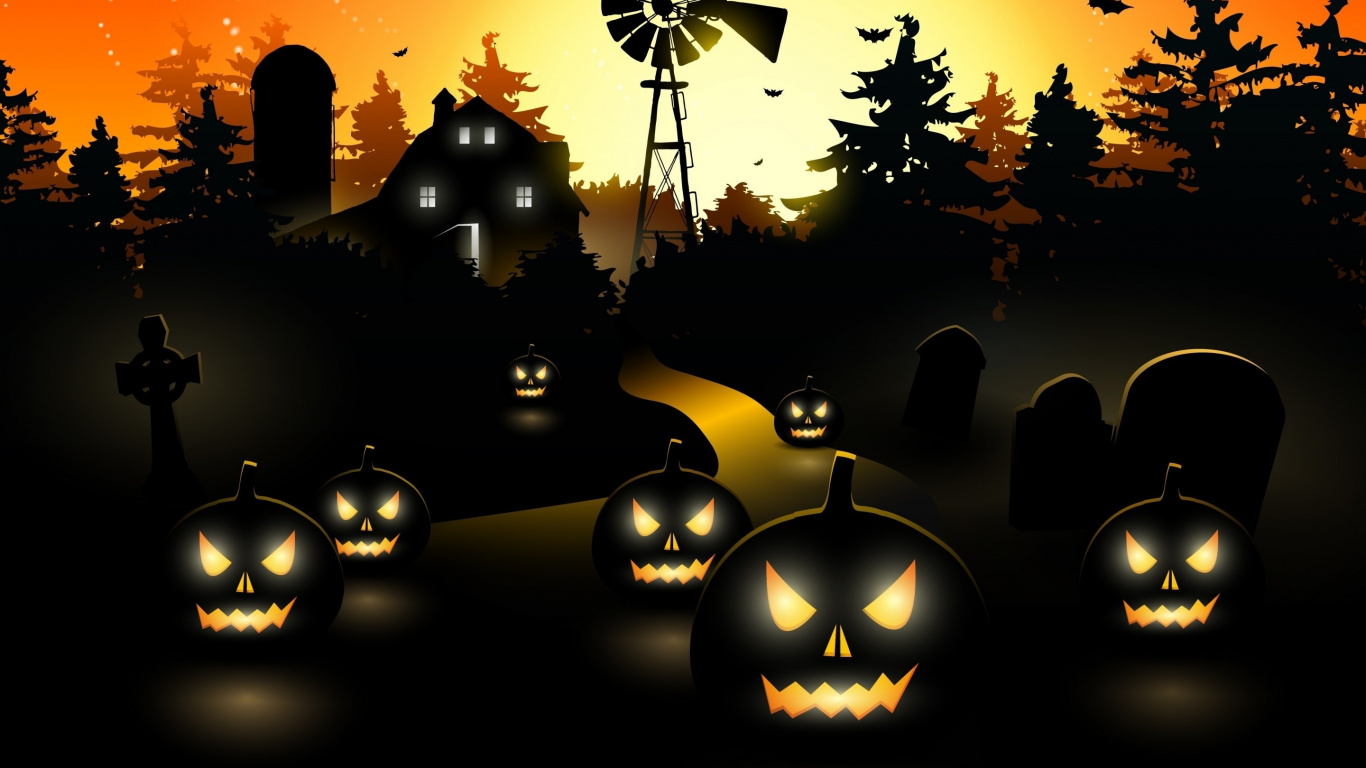 Обои 1366x768 векторная графика, дом с привидениями, тыква, темнота, дерево, HD ready картинка