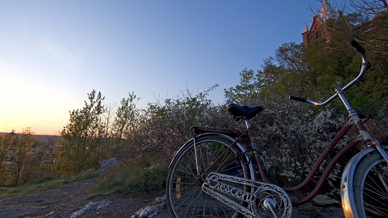 Обои 1280x720 велосипед, природа, вечер, ветки, HD, HDV, 720p, 16:9 картинка