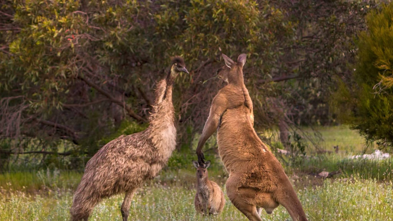 Обои 1366x768 Сумчатые, эму, красный кенгуру, живая природа, наземные животные, HD ready картинка