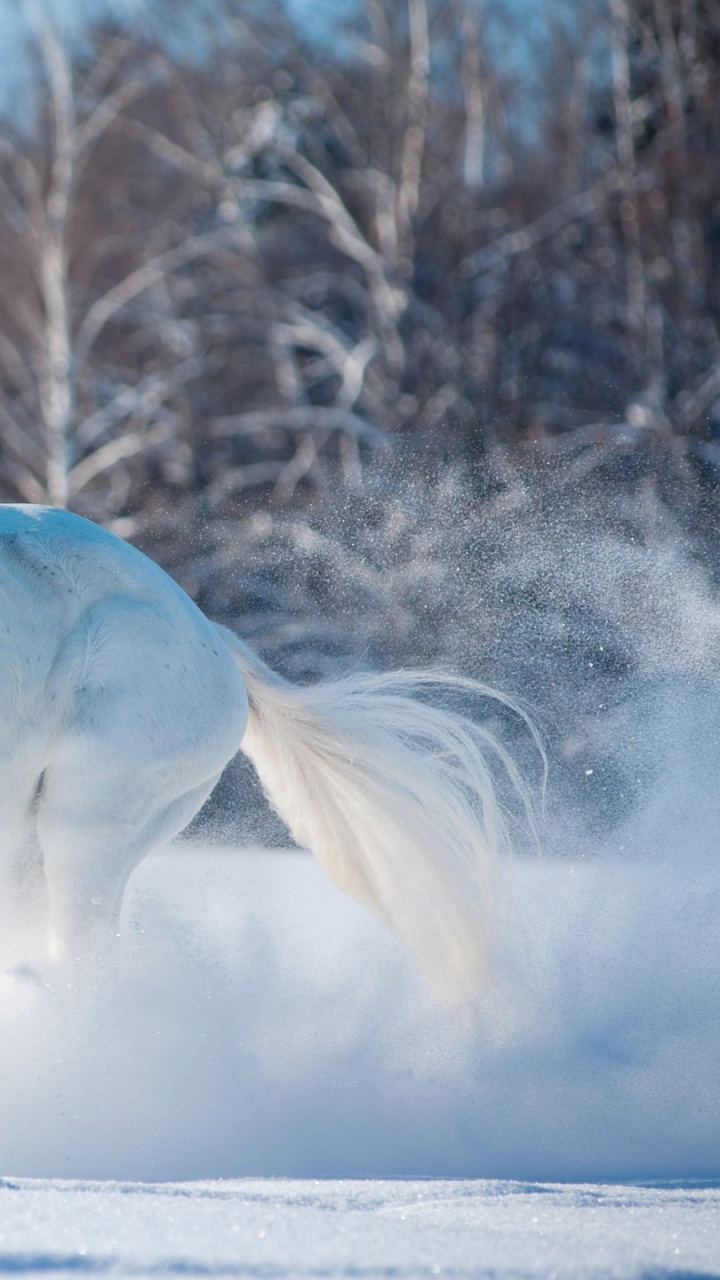 Обои конь, грива, жеребец, зима, снег для HD Samsung Galaxy S3/J3/J4/J5, Meizu M5, Sony Xperia L1/L2, заставка, 720x1280 картинка