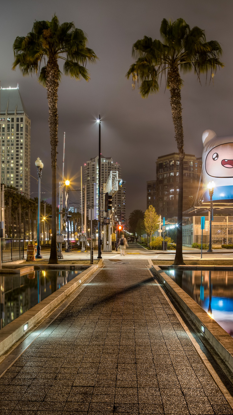 Обои Сан Диего, ночь, город, городской район, отражение для iPhone 6, 6S, 7, 8, заставка, 750x1334 картинка