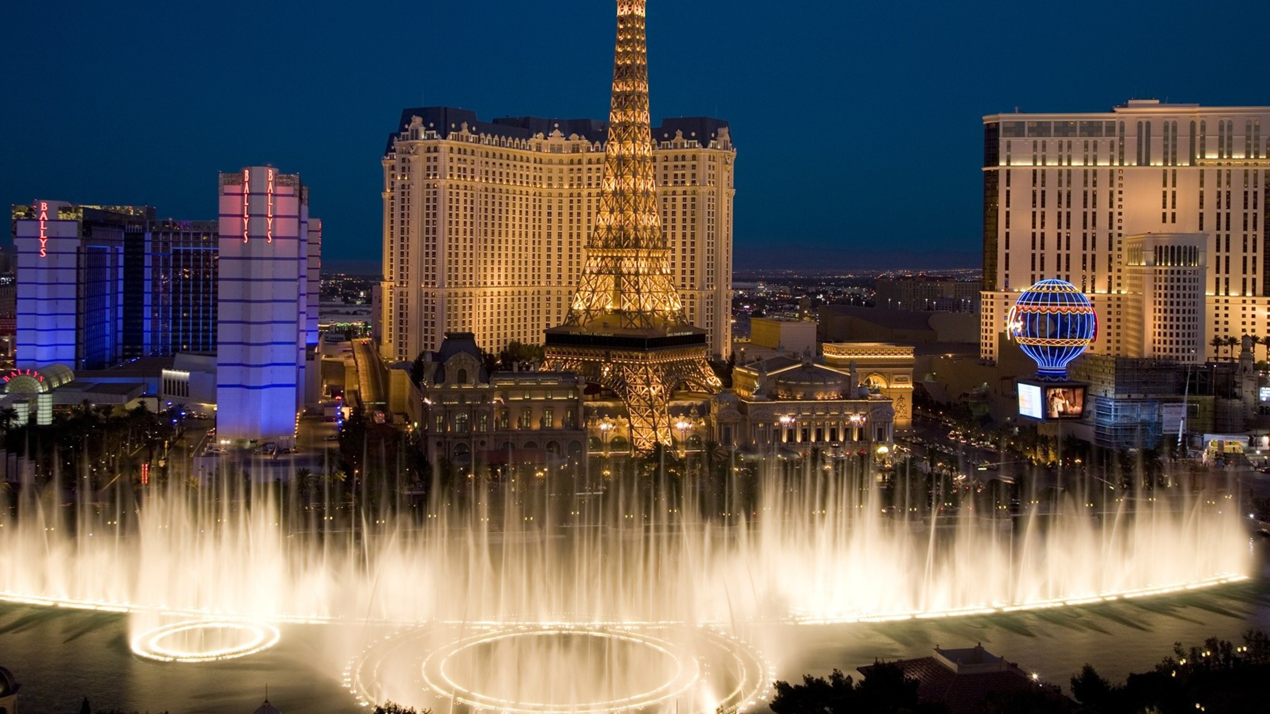 Обои 2560x1440 Отель Белладжио и казино, фонтан, город, ориентир, городской пейзаж, WQHD, QHD, 16:9 картинка