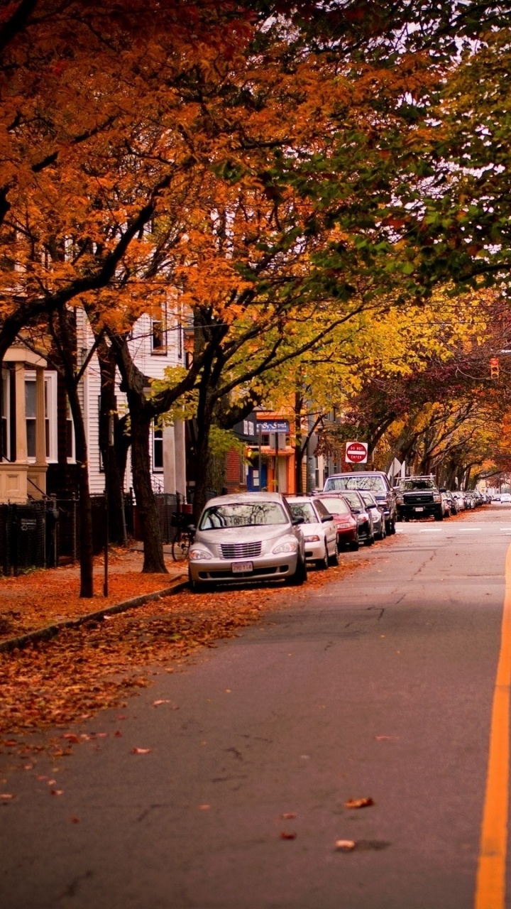Обои осень, дерево, лист, переулок, городской район для HD Samsung Galaxy S3/J3/J4/J5, Meizu M5, Sony Xperia L1/L2, заставка, 720x1280 картинка