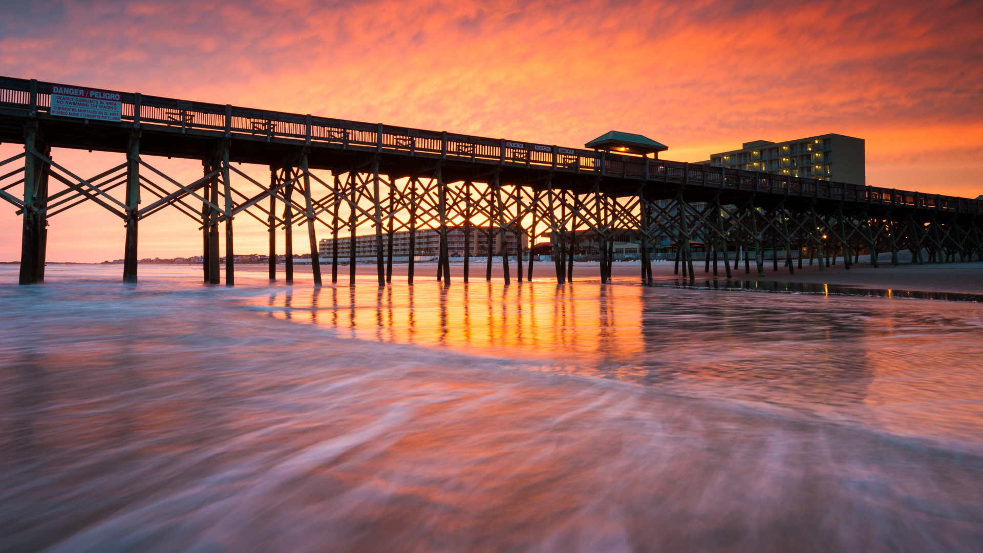 Обои 1920x1080 пляж, Пирс, вода, отражение, закат, Full HD, HDTV, 1080p 16:9 картинка