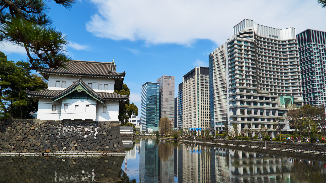 Обои 1366x768 Императорский Дворец В Токио, фасад, здание, архитектура, водный путь, HD ready картинка