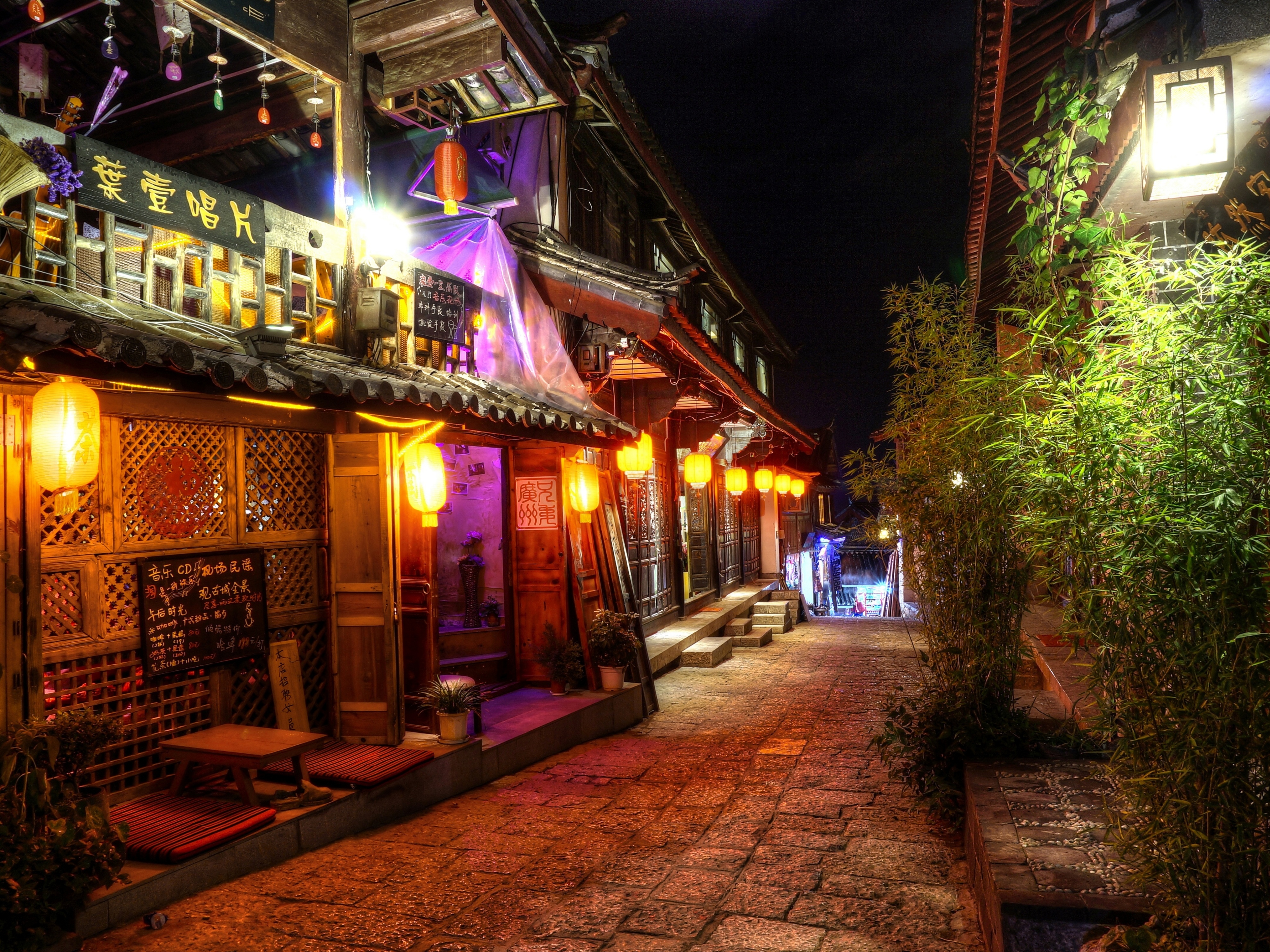 Обои ночь, городок, улица, аллея, паб, фото, заставка