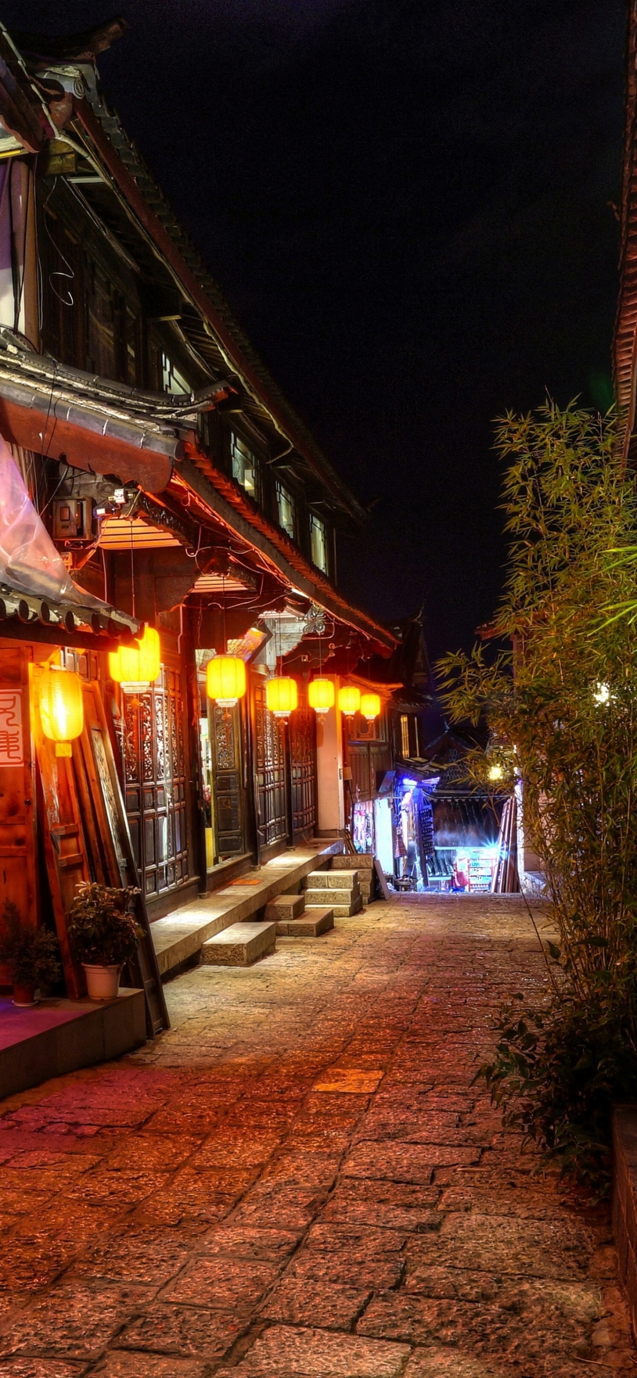 Обои ночь, городок, улица, аллея, паб для iPhone XS Max, заставка, 1242x2688 картинка