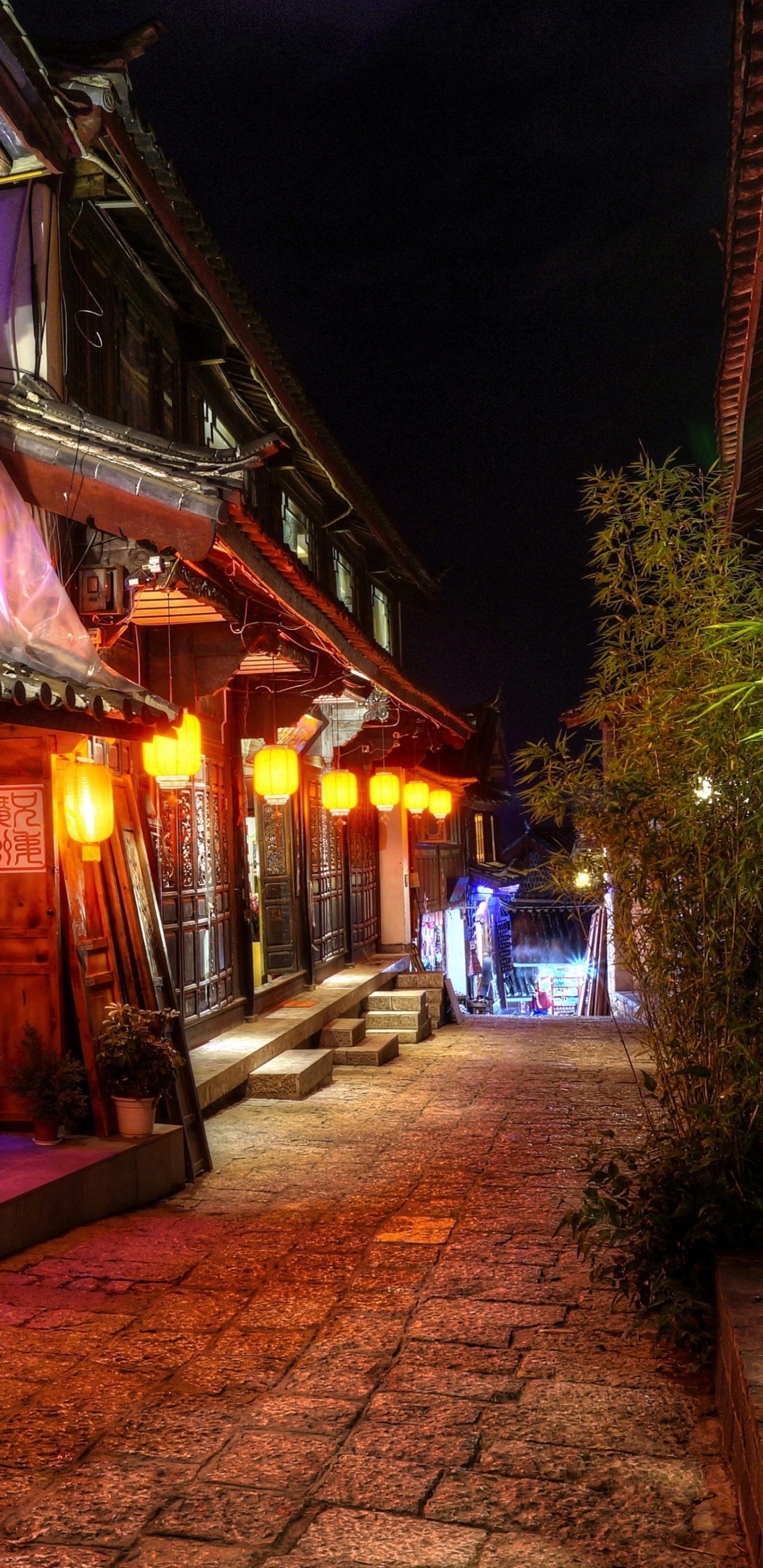Обои ночь, городок, улица, аллея, паб для Samsung Galaxy S8/S8+/S9/S9+/Note 8/Note 9 QHD, заставка, 1440x2960 картинка