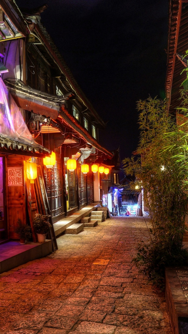 Обои ночь, городок, улица, аллея, паб для HD Samsung Galaxy S3/J3/J4/J5, Meizu M5, Sony Xperia L1/L2, заставка, 720x1280 картинка