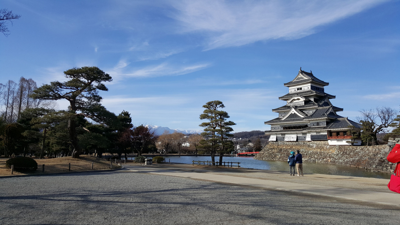 Обои 1366x768 Замок Мацумото, достопримечательность, дерево, облако, вышка, HD ready картинка