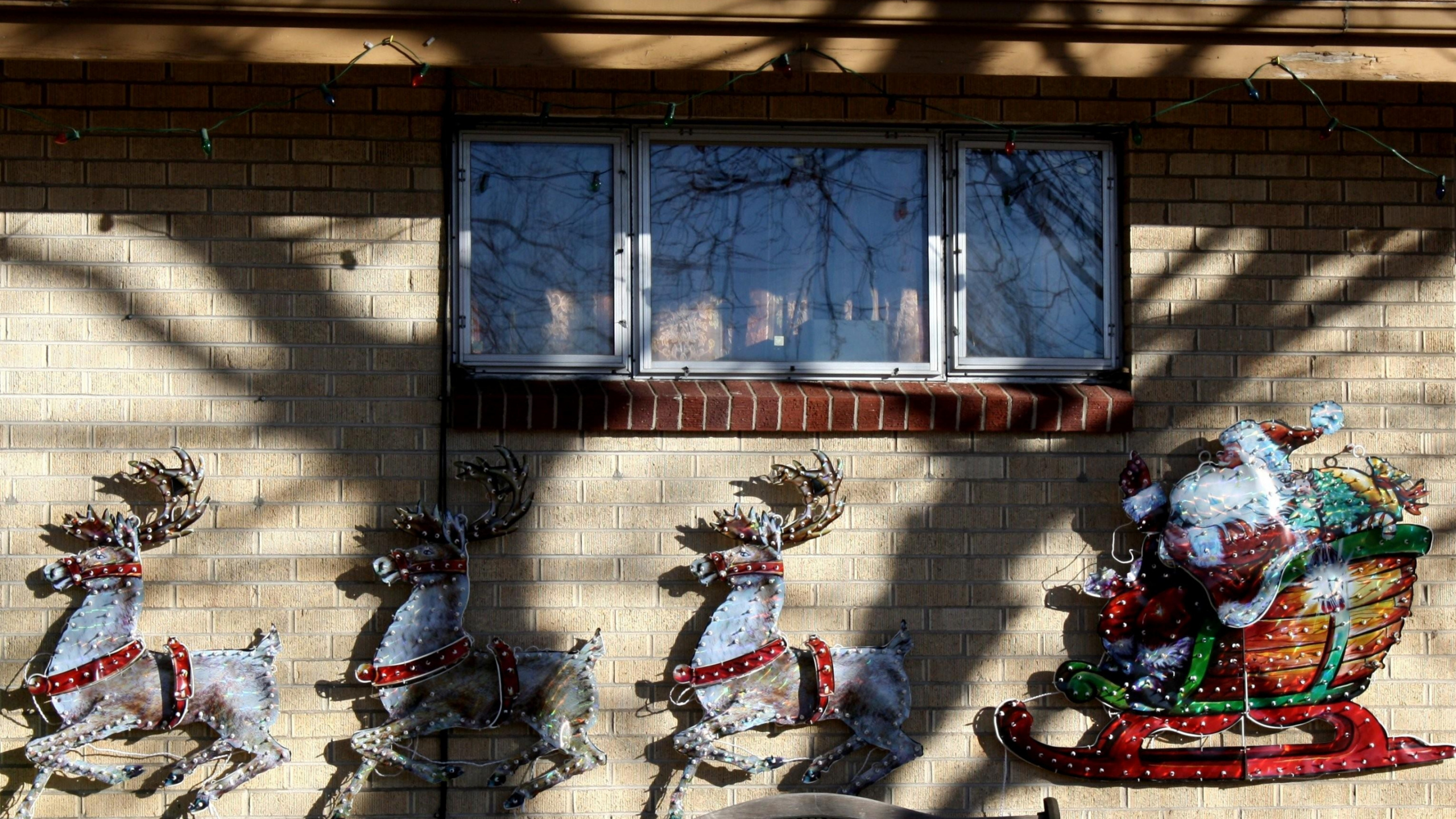 Обои 2560x1440 Северный олень, елка, сани, гирлянда, отдых, WQHD, QHD, 16:9 картинка