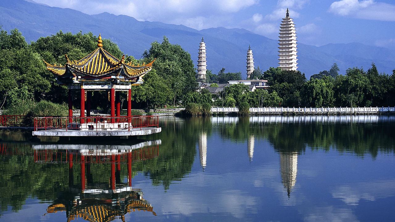 Обои 1280x720 Китай, отражение, пагода, вода, китайская архитектура, HD, HDV, 720p, 16:9 картинка