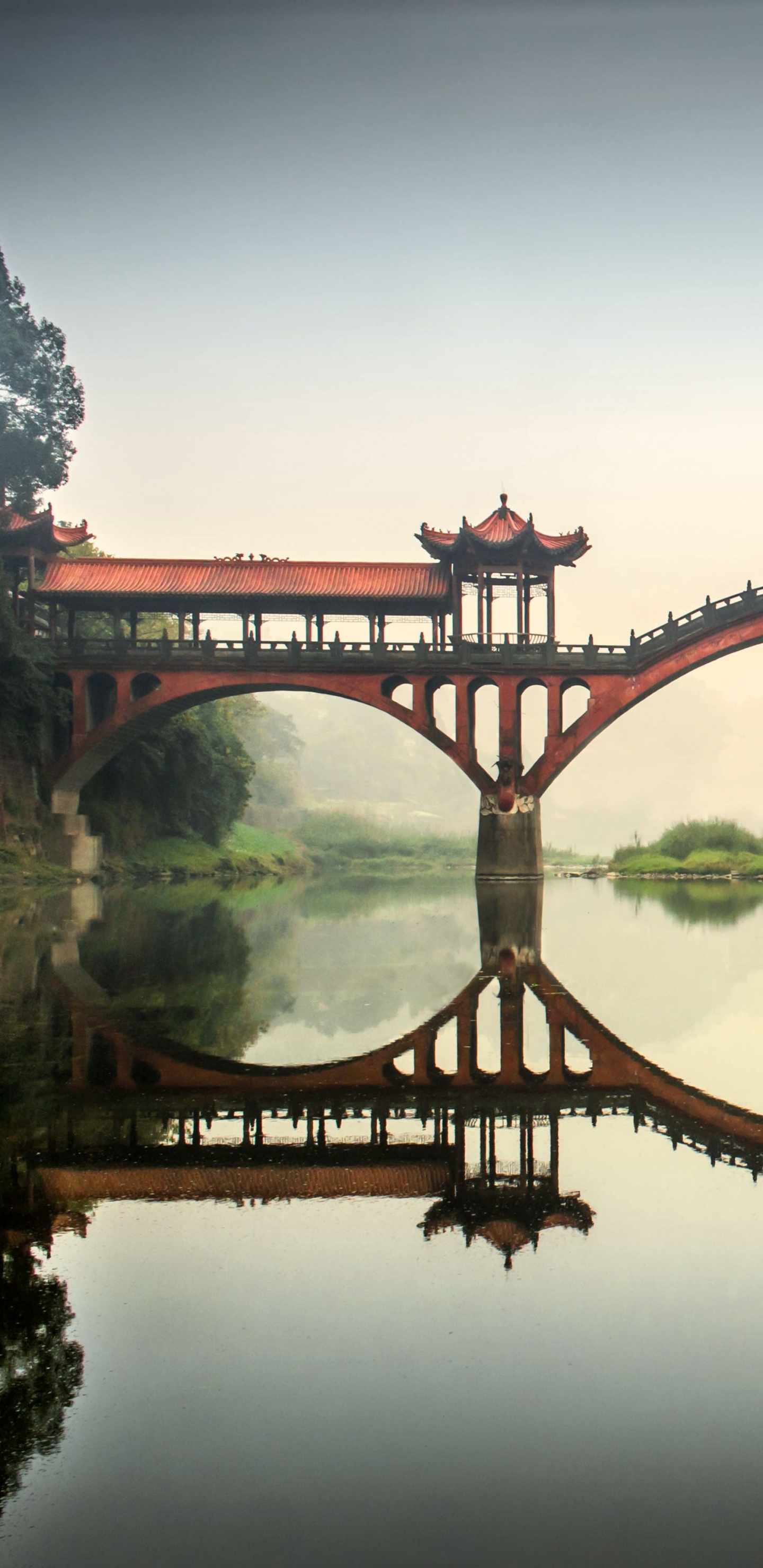 Обои Лэшань Гигантский Будда, отражение, природа, мост, арочный мостик для Samsung Galaxy S8/S8+/S9/S9+/Note 8/Note 9 QHD, заставка, 1440x2960 картинка