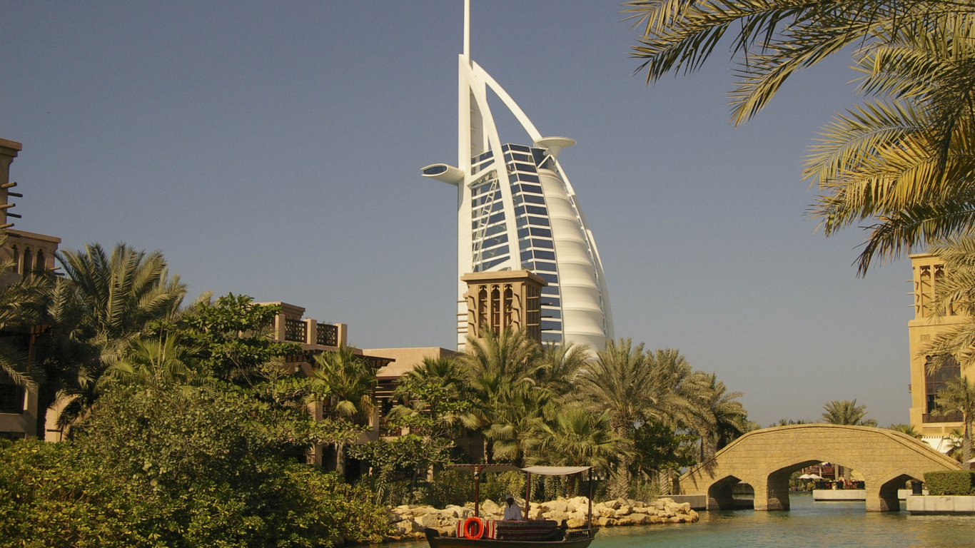 Обои 1366x768 Бурдж Аль араб, достопримечательность, небоскреб, вышка, дерево, HD ready картинка