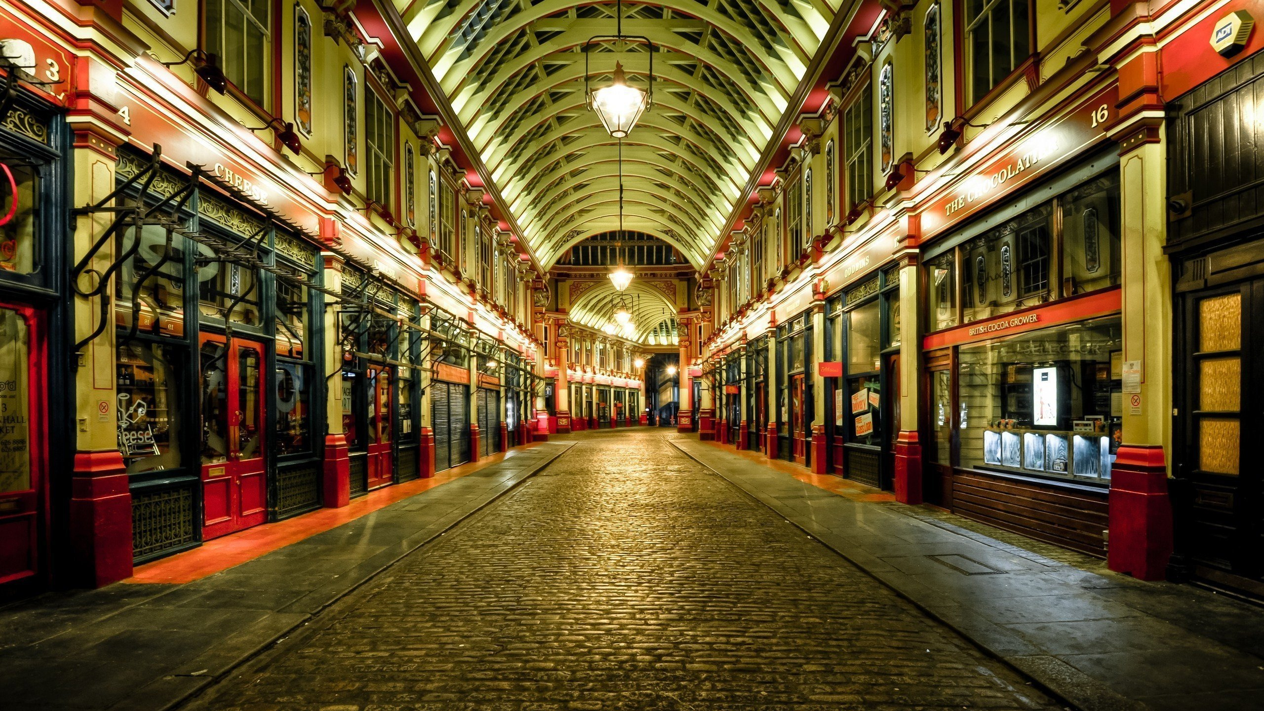 Обои 2560x1440 рынок Лиденхолл, здание, аркада, симметрия, ночь, WQHD, QHD, 16:9 картинка