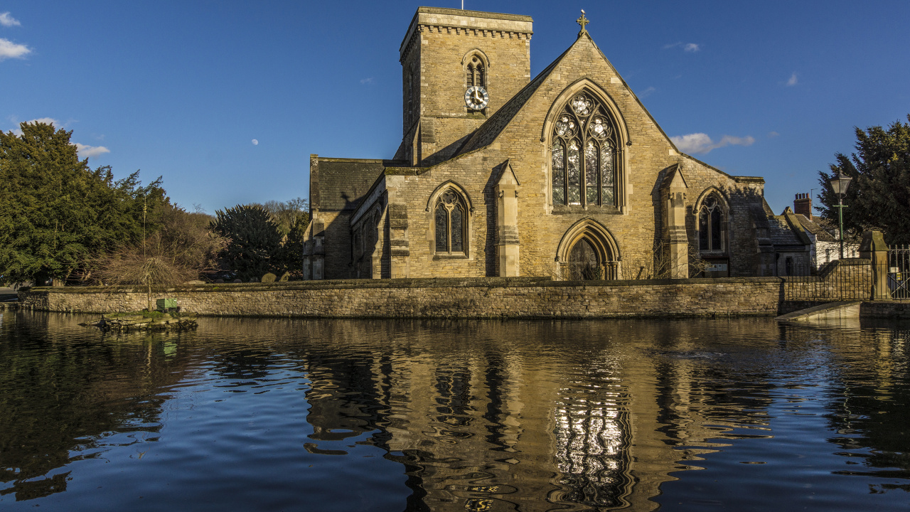 Обои 1280x720 отражение, здание, вода, церковь, водный путь, HD, HDV, 720p, 16:9 картинка