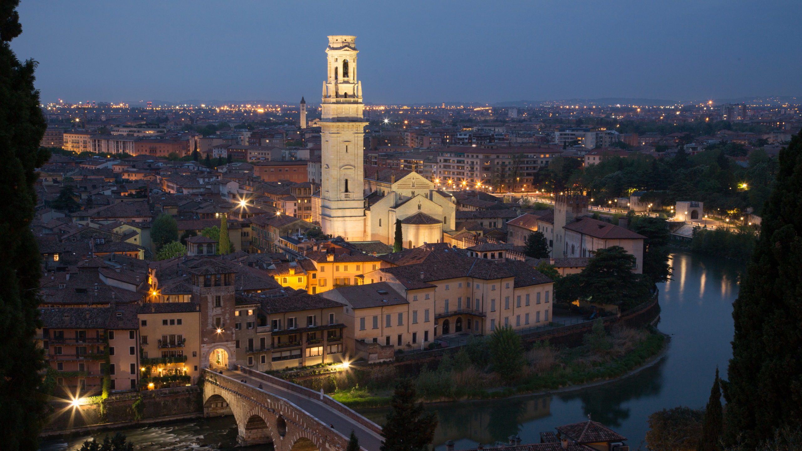 Обои 2560x1440 Верона, достопримечательность, ориентир, ночь, реки, WQHD, QHD, 16:9 картинка