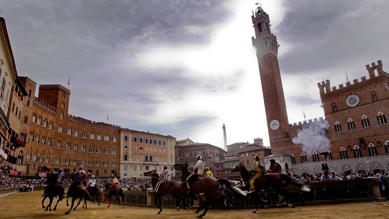 Обои 1280x720 Палаццо Пубблико, конь, Палио ди Сиена, городская площадь, город, HD, HDV, 720p, 16:9 картинка