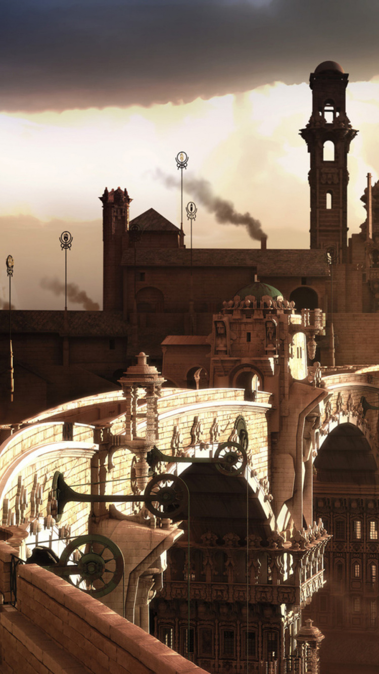Обои стимпанк, компьютерная игра, здание, Научная фантастика, фэнтези для iPhone 6, 6S, 7, 8, заставка, 750x1334 картинка