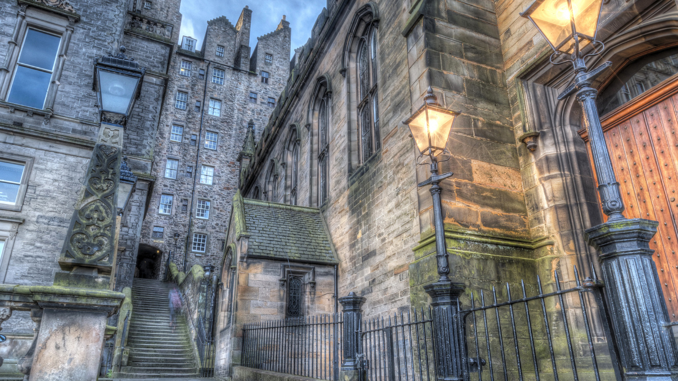 Обои 1366x768 средневековая архитектура, Эдинбург, здание, улица, фасад, HD ready картинка