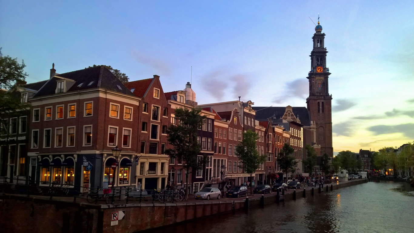 Обои 1366x768 Вестеркерк, канал, здание, архитектура, водный путь, HD ready картинка