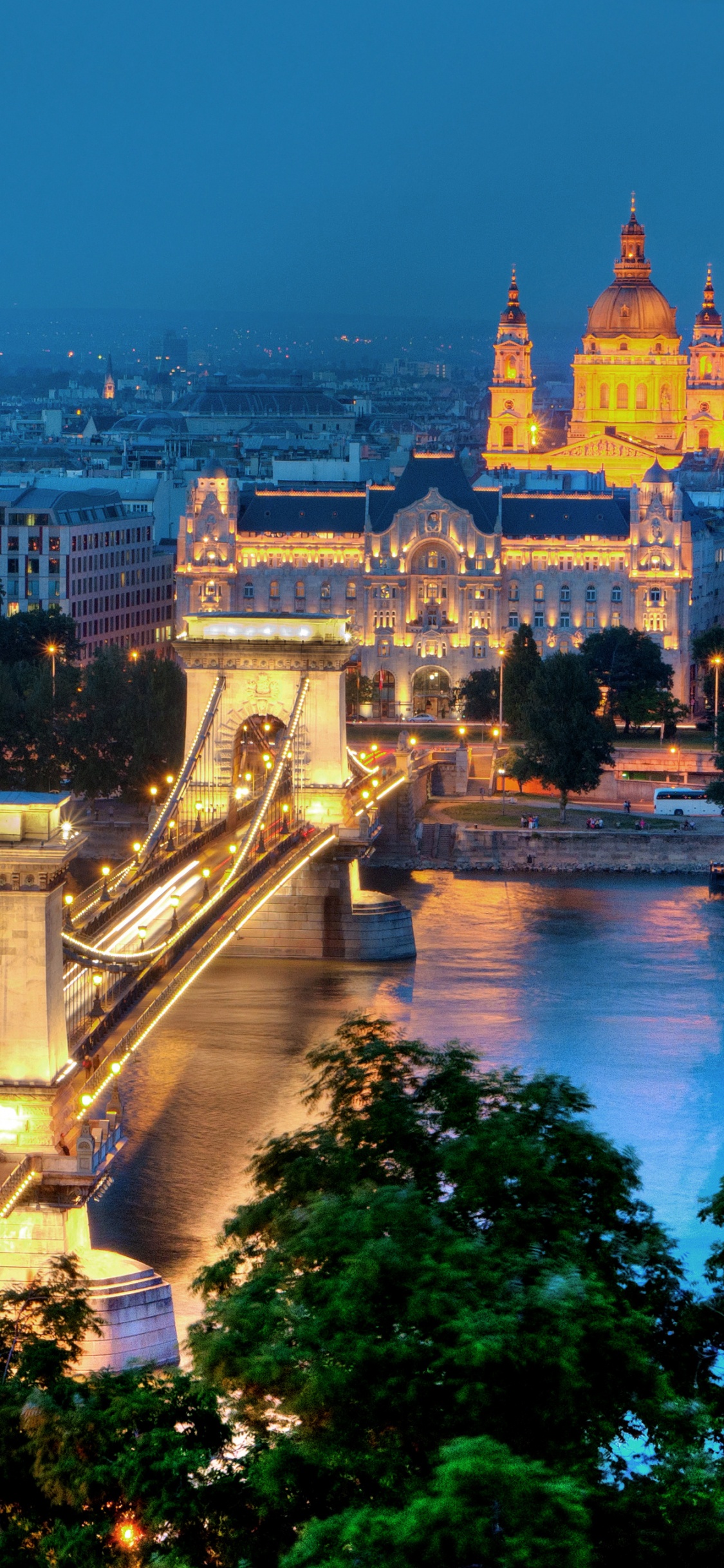 Обои узкий цепной мост, Святого Иштвана, Здание Венгерского Парламента, ориентир, городской пейзаж для iPhone X / XS, заставка, 1125x2436 картинка