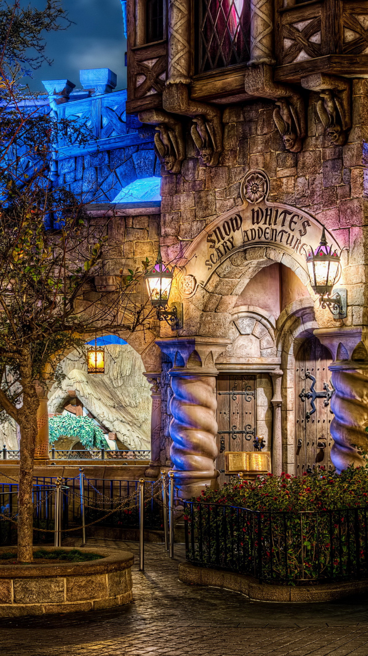 Обои парк развлечений, ночь, освещение, дерево, Диснейленд для iPhone 6, 6S, 7, 8, заставка, 750x1334 картинка