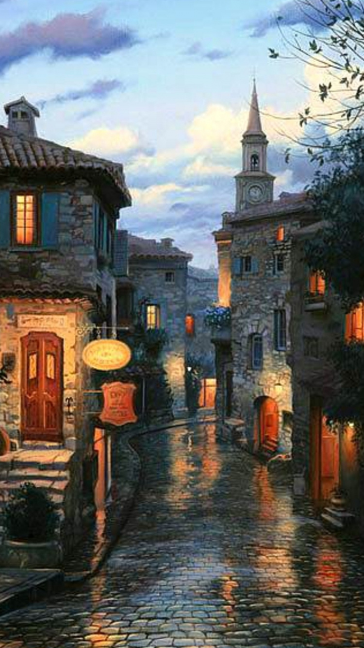 Обои живопись, вечер, арт, городок, ночь для iPhone 6, 6S, 7, 8, заставка, 750x1334 картинка