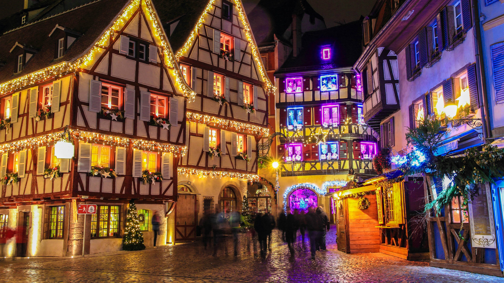 Обои 1920x1080 Christkindelsmrik Страсбург, Рождественский рынок, Рождественский день, ночь, городок, Full HD, HDTV, 1080p 16:9 картинка