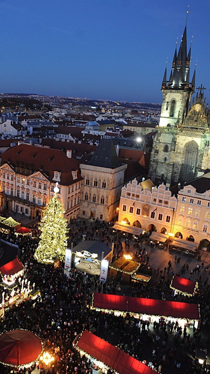Обои Прага, Рождественский день, Рождественский рынок, ориентир, город для HD Samsung Galaxy S3/J3/J4/J5, Meizu M5, Sony Xperia L1/L2, заставка, 720x1280 картинка