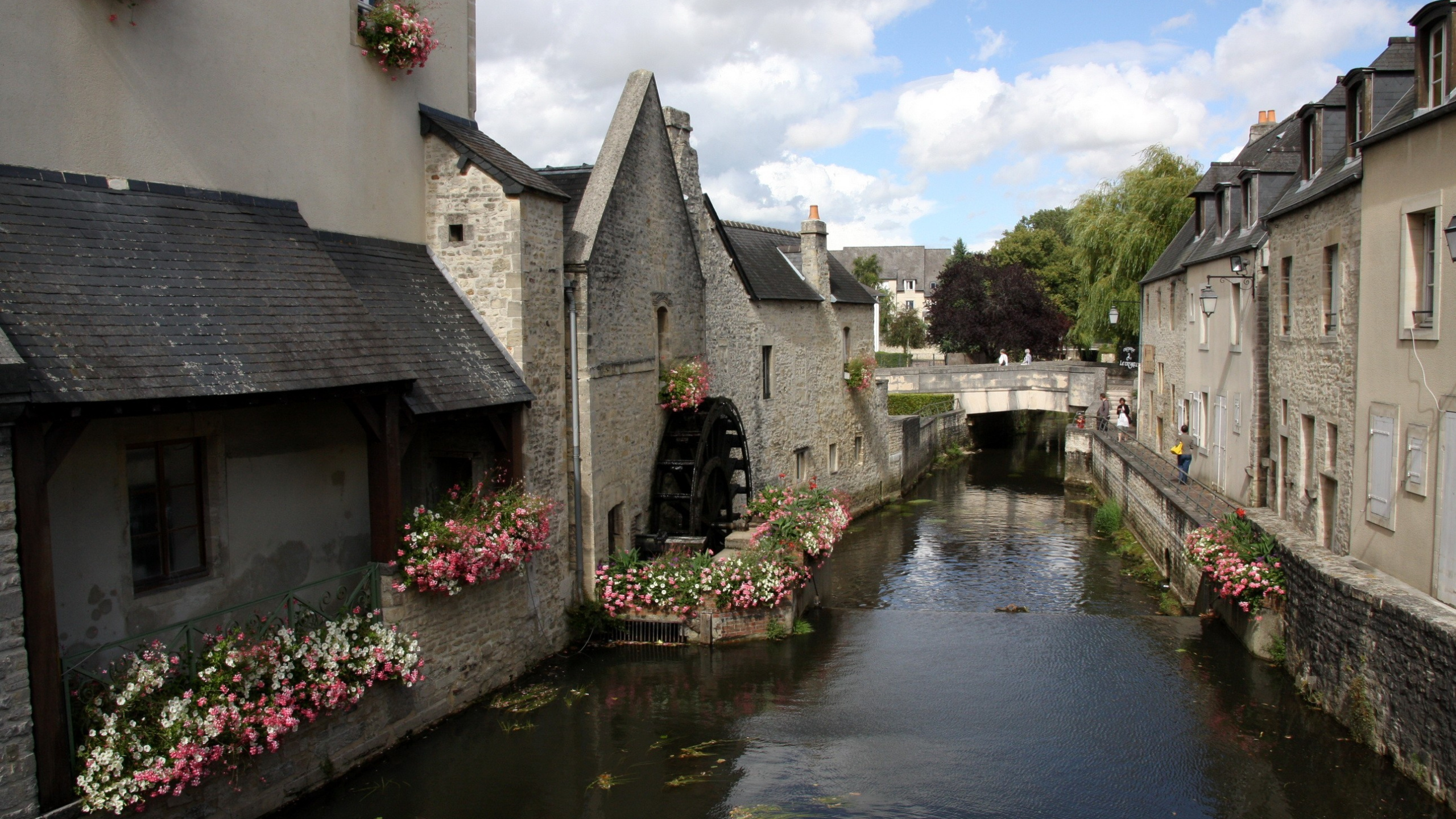 Обои 2560x1440 водяное колесо, водный путь, канал, городок, вода, WQHD, QHD, 16:9 картинка