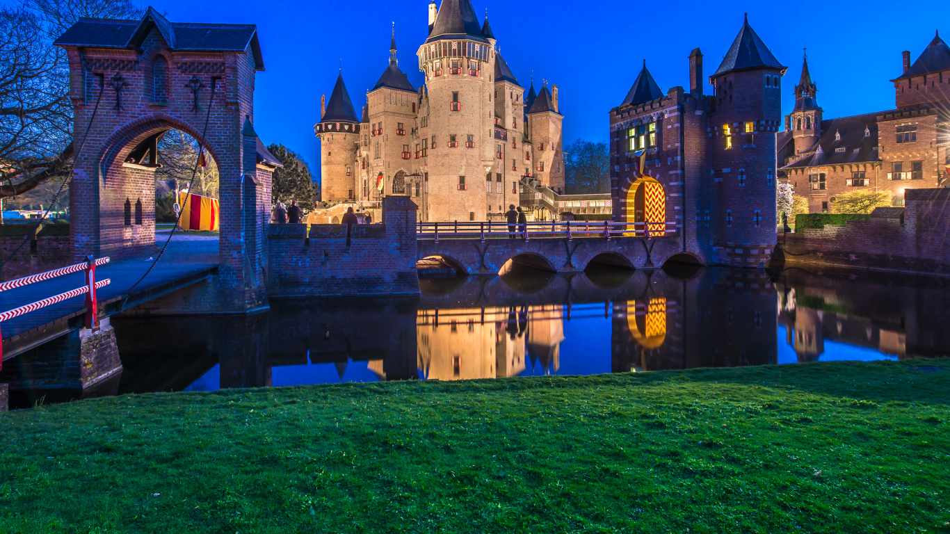Обои 1366x768 замок, Замковый мост, ориентир, архитектура, ночь, HD ready картинка