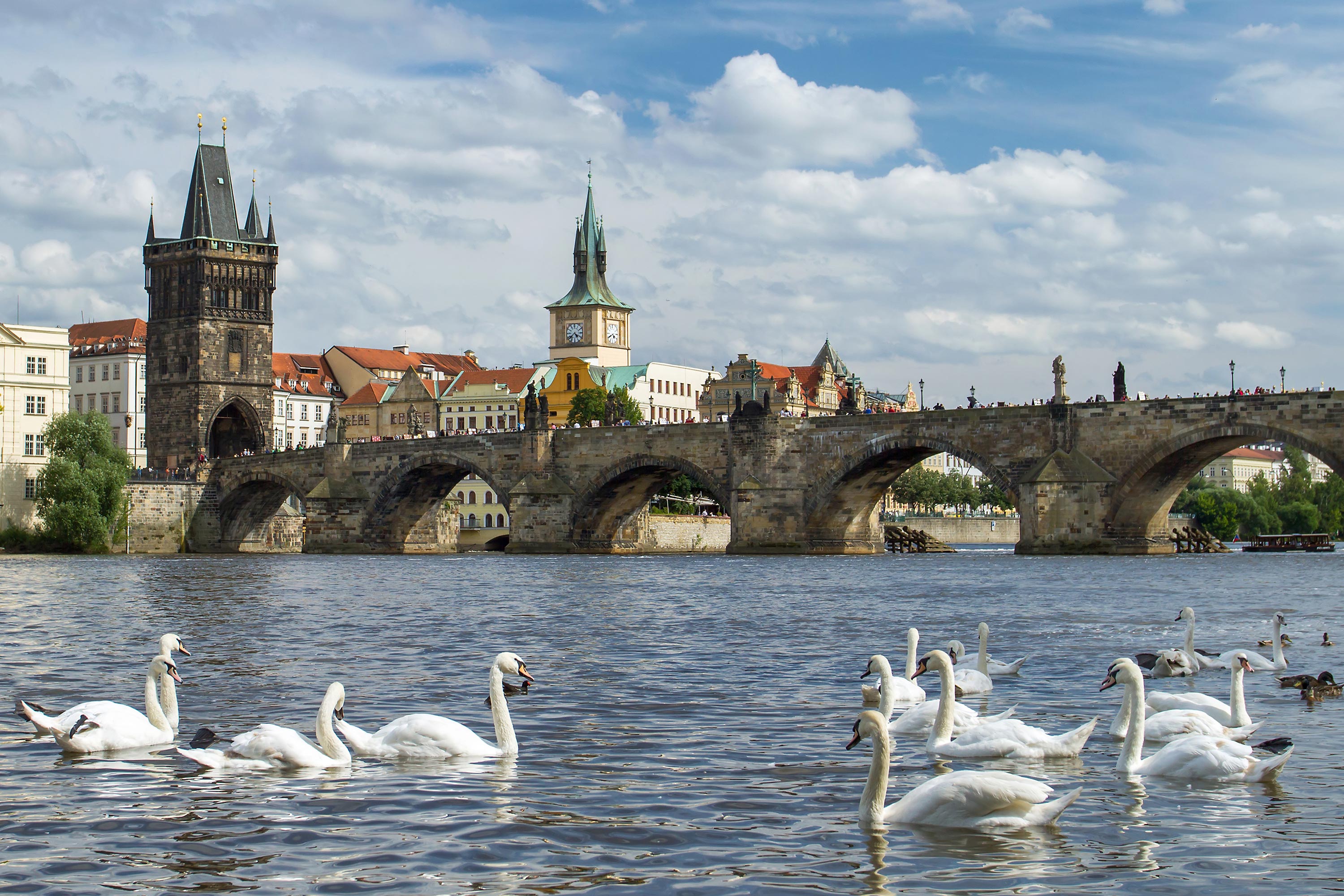 Обои Карлов мост, мост, птица, водоплавающие птицы, вода, фото, заставка